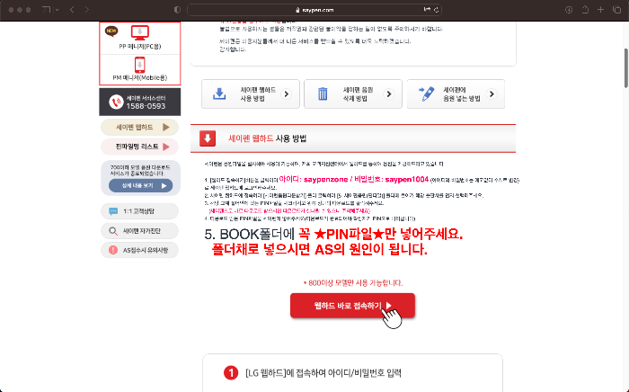 우리는 핀파일매니저가 아닌 좌측 메뉴에 있는 '세이펜 웹하드'를 이용할 것이다. 세이펜 웹하드를 클릭하고 이어 나오는 창에서 아이디와 비밀번호를 확인하고 '웹하드 바로 접속하기'를 눌러준다.