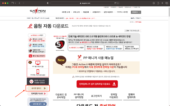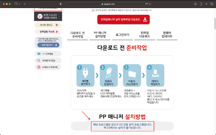 다시 세이펜 홈페이지에서 '음원 다운로드' 탭을 클릭하면 '핀파일매니저'를 설치하라고 나온다. 하지만 위의 첫번째 사진에 빨간색 네모 부분을 읽어보면 핀파일매니저는 맥os에서는 설치가 불가함을 알 수 있다. 그럼 이제부터 본격적으로 맥북에서 세이펜 음원 다운로드 하는 법을 알아보자.