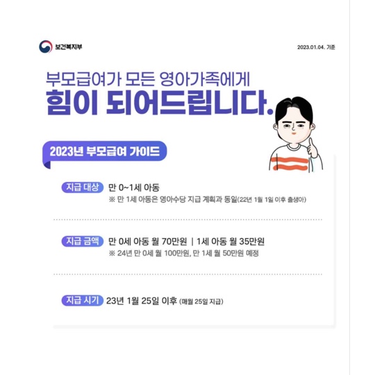 *기존(22년 12월)에 영아수당을 받고 있는 부모는 새롭게 신청할 필요 없이 23년 1월부터 자동으로 부모급여가 적용되어 지급된다.