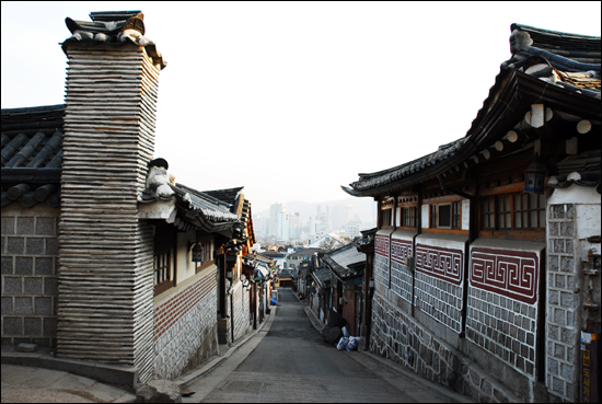 - 북촌 제1경: 한옥이 늘어선 언덕길에서 내려다보는 서울 전경
