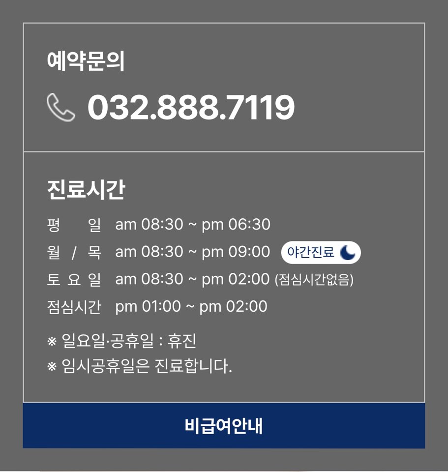 일주일에 두번 월요일과 목요일에 야간 진료를 하고 있습니다. 토요일에는 점심시간 없이 오후 2시까지 진료합니다. 저는 토요일 오전에 방문했는데 7번째 순서로 진료볼 수 있었습니다. 진료실은 1진료실과 2진료실이 있고, 두 분 원장님께서 진료하고 계셨습니다.