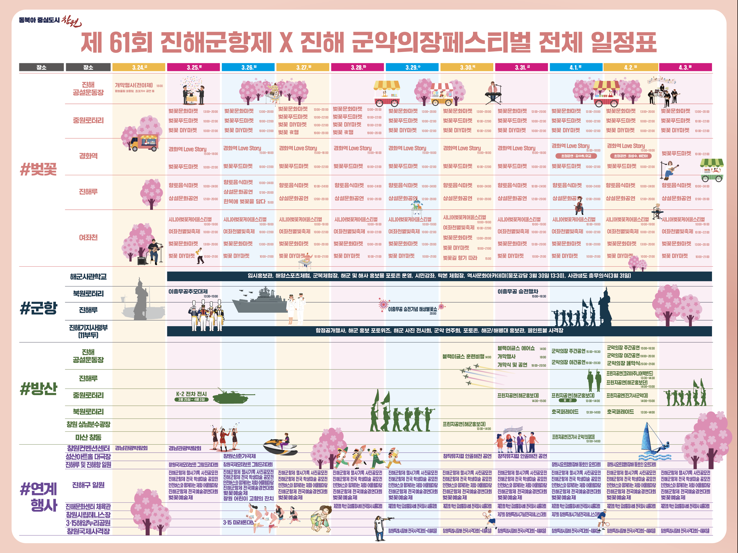 축제가 진행되는 3월 25일부터 4월 3일까지 기간 중에는 평소 자유 출입이 허가되지 않는 장소가 일반 관광객들에게 오픈됩니다. 바로 해군사관학교와 해군 진해기지사령부인데요. 축제 기간에 방문하시는 분들은 이 두 곳도 방문해 둘러보시면 좋을 것 같습니다. 특히 3월 31일에는 군악의장 페스티벌도 진행된다고 하니 참고해주세요.