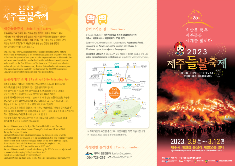 2023 제주들불축제는 3월 9일 목요일부터 3월 12일 일요일까지 진행됩니다. 매일 다른 주제로 축제가 진행됩니다.