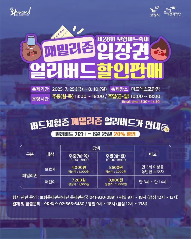 6월 25일까지 얼리버드 기간 동안 체험존 입장권을 20% 할인된 가격으로 구매하실 수 있습니다.