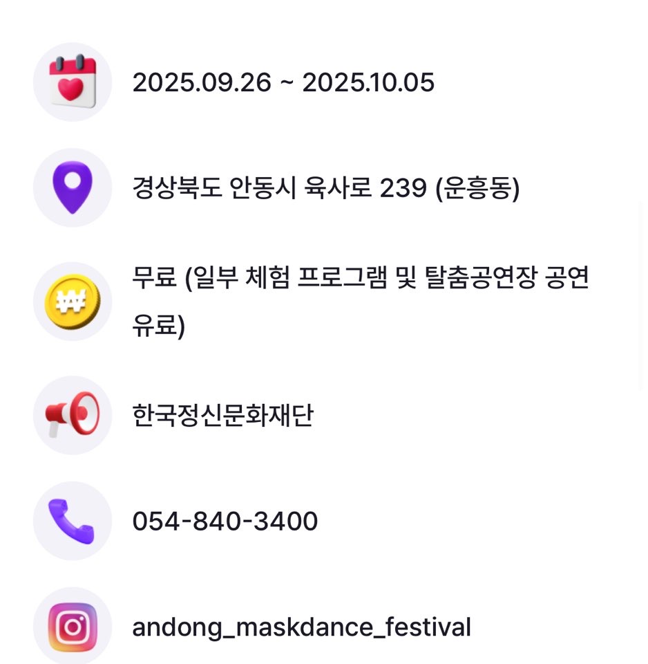 안동국제탈춤페스티벌은 한국의 전통문화를 세계와 공유하는 글로벌 문화축제입니다. 가족, 연인, 친구, 또는 안동 혼자 여행을 계획 중인 분들에게도 매우 적합합니다.