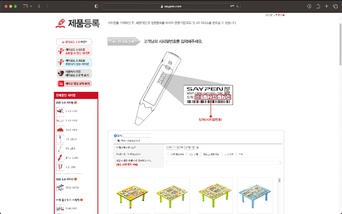 먼저 세이펜 홈페이지에서 회원가입을 해야 한다. 그리고 바로 제품등록을 해주면 되는데, 본인이 구매한 세이펜 제품을 선택하고 세이펜에 붙여져있는 시리얼넘버를 입력하면 간단하게 등록이 완료된다. 나는 태극펜을 구매해서 제일 처음에 나오는 제품을 선택했다.