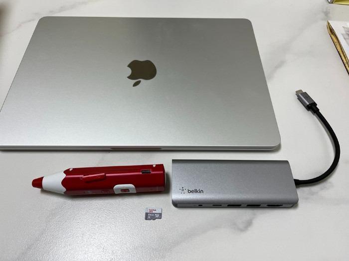 나는 맥북 에어 M2를 사용중이다. 맥os에서는 USB커넥터가 아닌 SD카드를 통해 음원을 넣어줘야 한다. 세이펜 측면에 장착되어 있는 SD카드를 분리해 SD카드 리더기를 이용해 가지고 있는 맥북과 연결한다. 나는 이 작업을 해주기 위해 SD리더기를 포함하고 있는 '벨킨 멀티허브'를 구입했다.